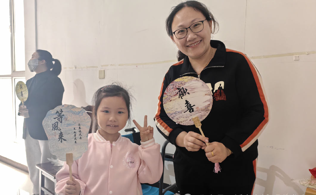 理论讲解后,活动进入实践环节。孩子们和家长首先选择自己喜欢的大漆滴入水中,随后搅拌水面让大漆创造出独特的纹样,最后把扇子缓缓放入水,以旋转、划动等手法将大漆晕染在扇面上,一把把独一无二的漆扇便制作完成了。大家手持自己的作品,纷纷拍照留念,脸上洋溢着自豪与喜悦。