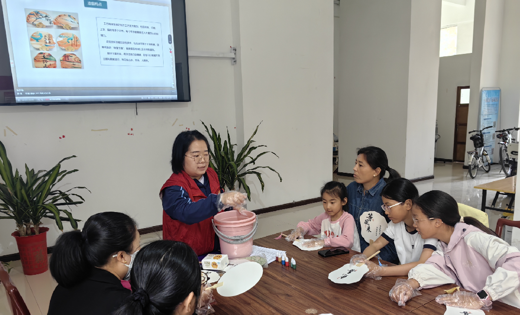 活动现场,巾帼志愿者化身“文化导师”,通过深入浅出地讲解和生动形象地展示,向大家介绍了漆扇制作的历史渊源、工艺特色。孩子们和家长们围坐在一起,认真聆听,感受非遗文化的深厚底蕴。