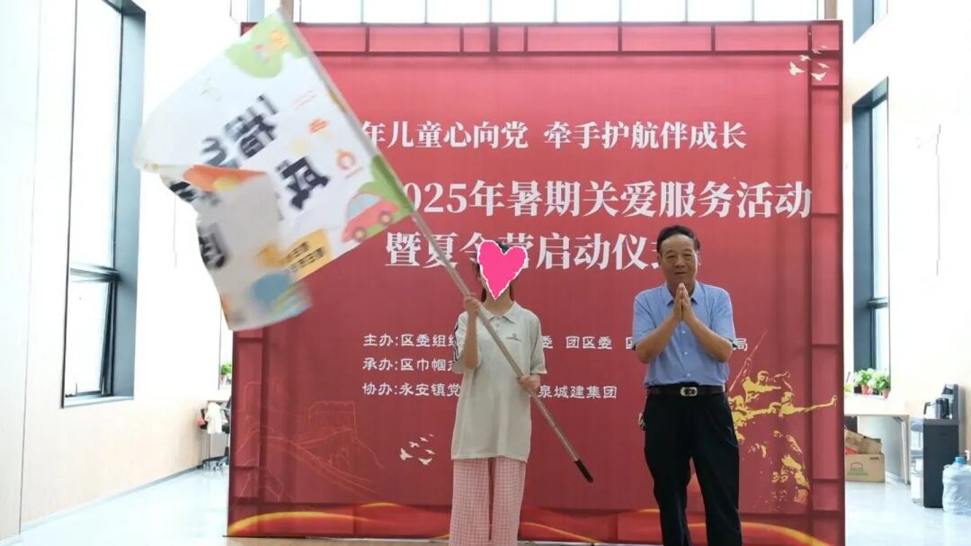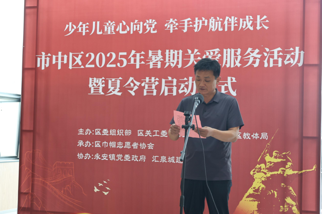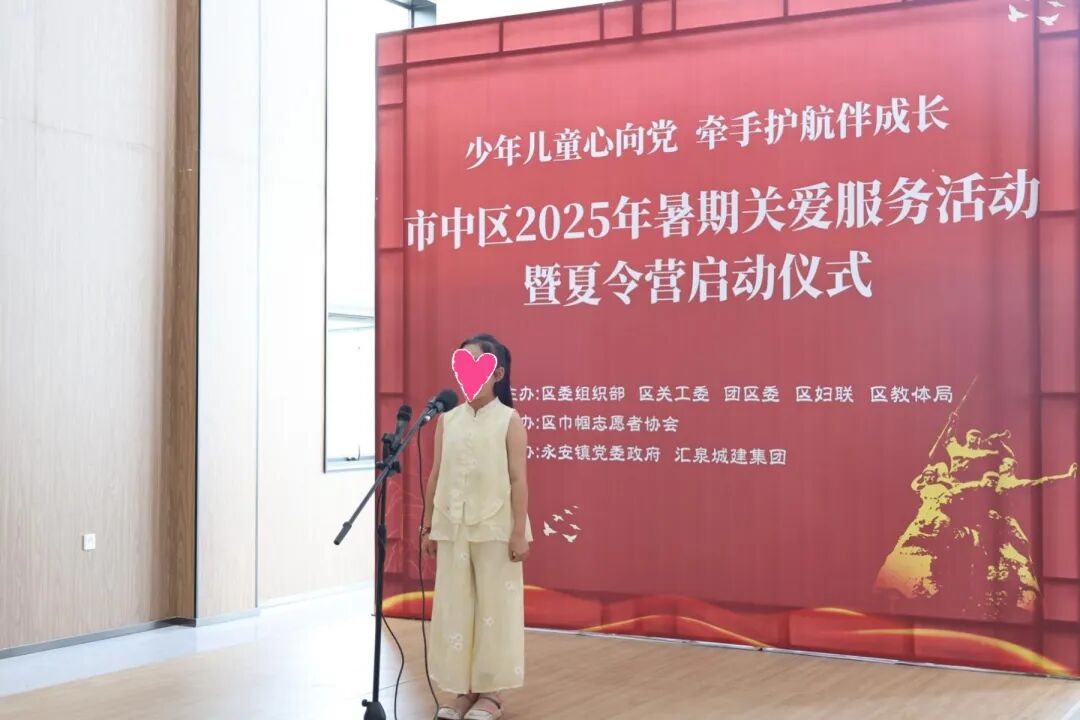 盛夏时节,榴花似火,情暖童心。为深入贯彻落实全国、省、市妇联 暑期儿童关爱服务部署,扎实推进“爱心妈妈”结对关爱工作,让困境(留 守)儿童在爱与陪伴中度过一个安全、充实、快乐的暑假。7 月 7 日上午, 由市中区委组织部、区关工委、团区委、区妇联、区教体局联合主办,区 巾帼志愿者协会承办,永安镇党委政府、汇泉城建集团共同协办的“少年 儿童心向党 牵手护航伴成长”——市中区 2025 年暑期关爱服务活动暨夏 令营活动在风景如画的薄板泉生态文化旅游小镇温暖启幕。区关工委常务 副主任、秘书长王广德出席并讲话。区妇联党组书记、主席姜正艳,区教 体局关工委常务副主任程恒田,团区委副书记石丽,永安镇人大主席颜士 龙, 汇泉城建集团副总经理郝军及爱心妈妈、 困境(留守)儿童代表共 50 余人参加活动,活动由区妇联党组成员、副主席金菊主持。