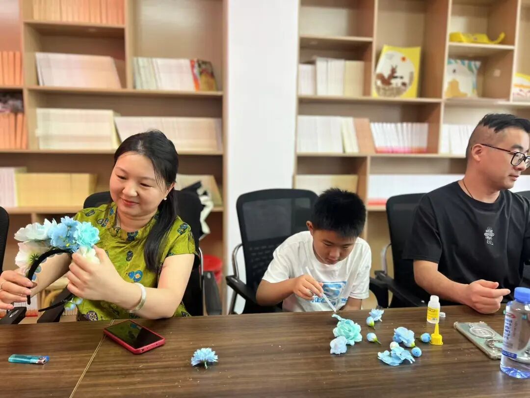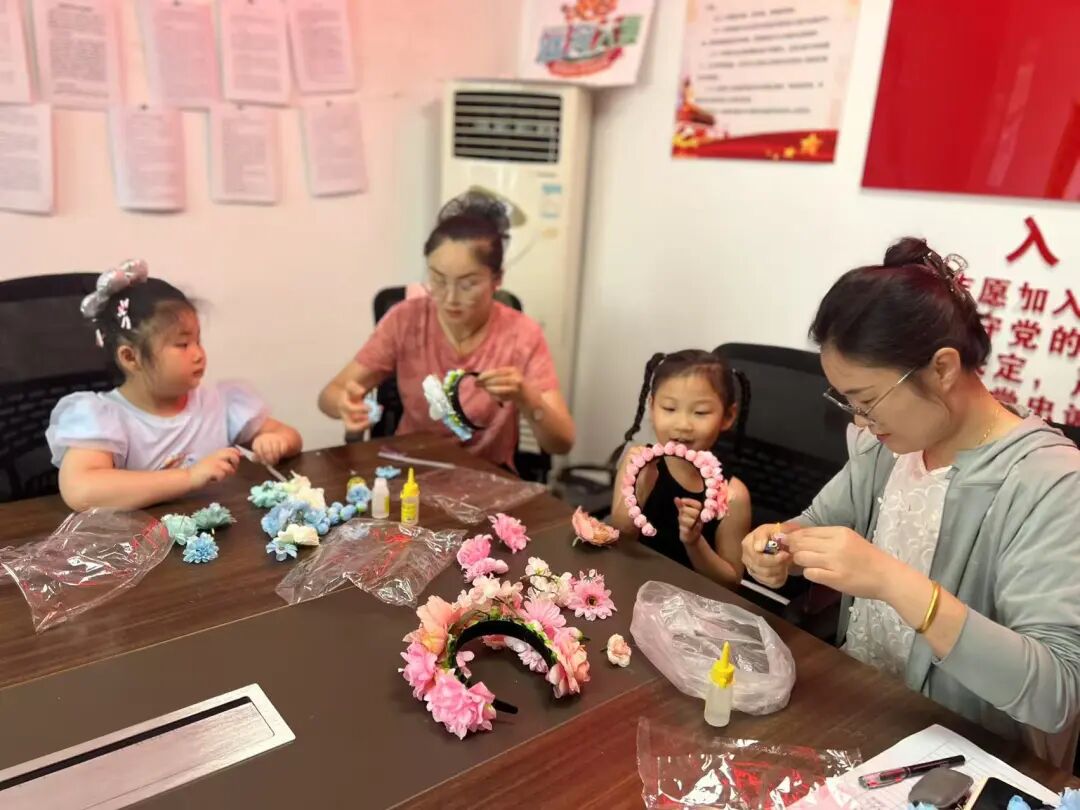随后进行的现场教学环节,老师现场演示簪花的工艺秘诀,传授色彩搭配法则和花片塑形技巧。最后,在老师的指导下,家长和孩子们纷纷动手,挑选心仪的材料,将一朵朵栩栩如生的绢花和装饰精心排列在发箍上。裁剪、粘贴、调整……经过精心制作,一个个独具匠心的簪花发箍惊艳亮相。