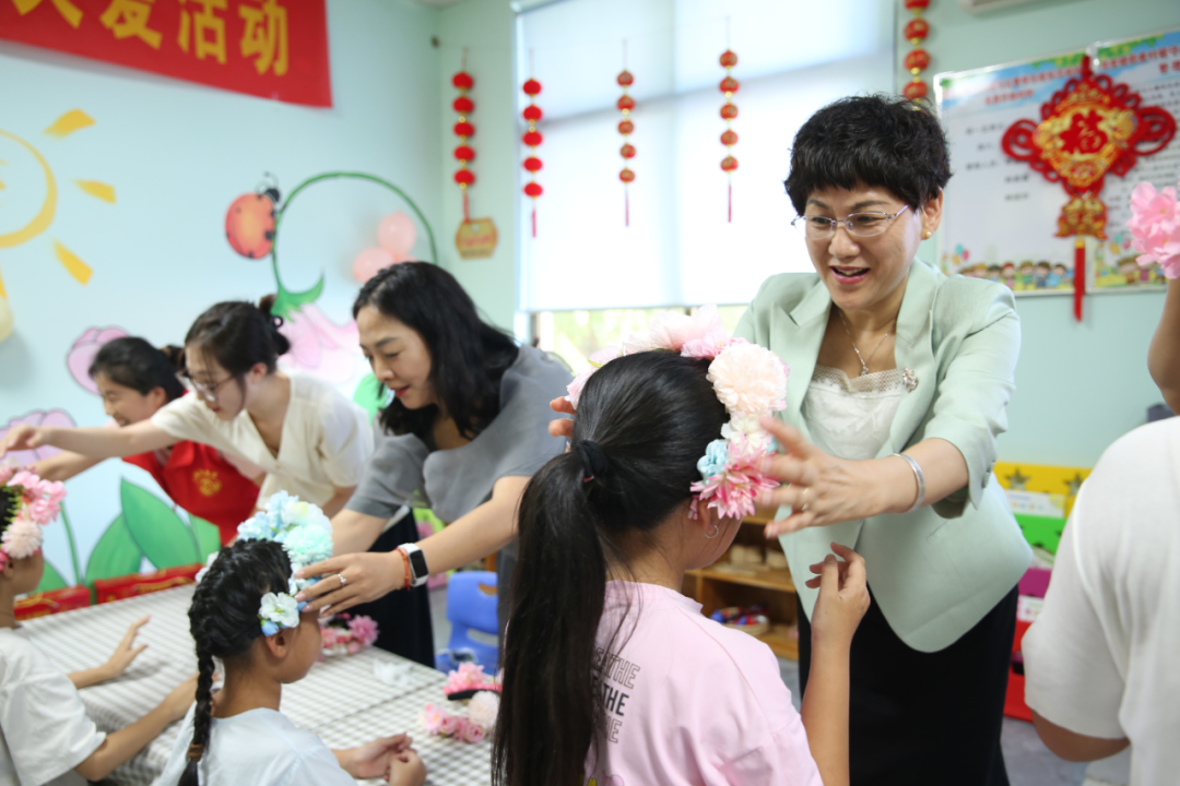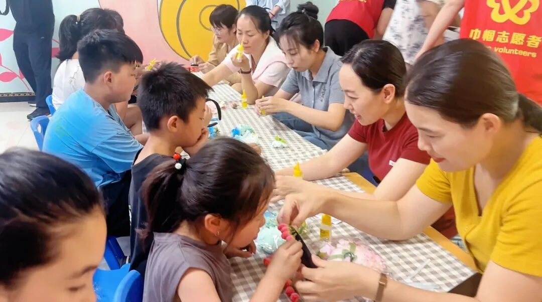 第二环节的簪花非遗文化体验活动同样温馨热闹。巾帼志愿者详细介绍了簪花的历史渊源与文化内涵,现场展示了传统簪花的制作步骤与技巧。随后,爱心妈妈与结对儿童两两一组,协作完成簪花制作。选材、上胶、定型……大家边学边做,一件件精美的簪花作品逐渐成形,爱心妈妈们小心翼翼地将亲手制作的簪花为结对儿童佩戴,并合影留念。