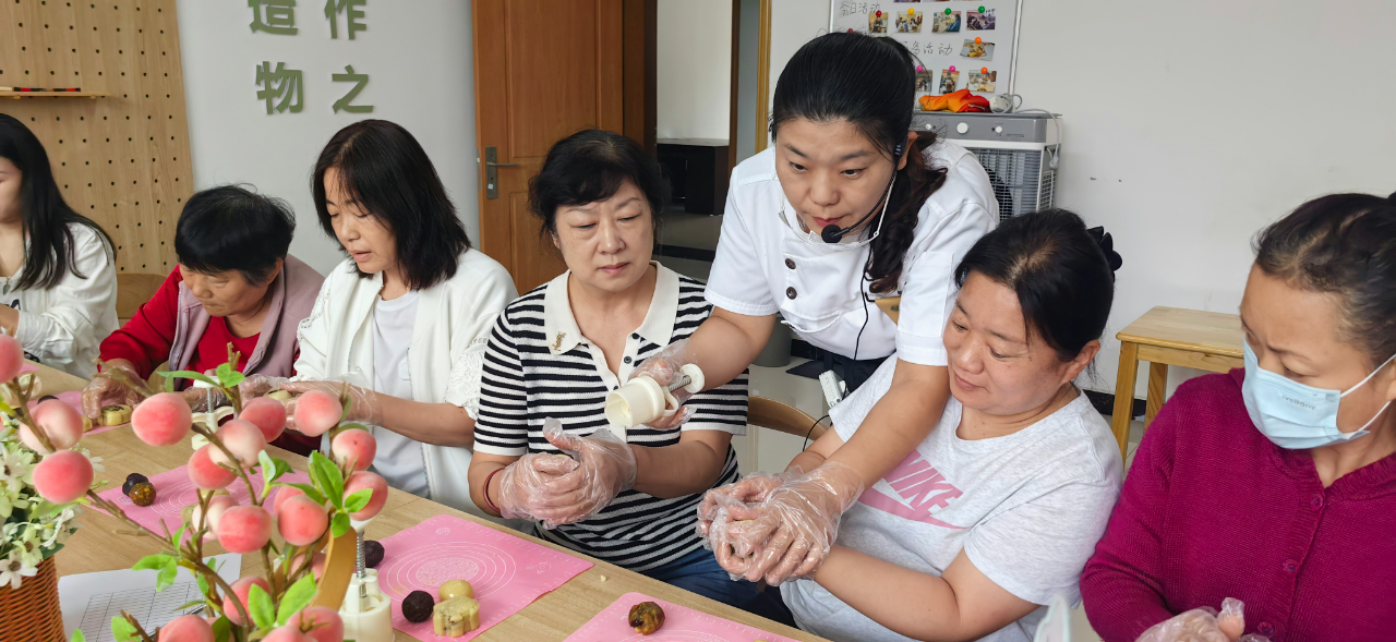 在常庄街道公园里社区的培训活动中,辖区妇女群众在巾帼志愿者和烘焙老师的带领下,一起动手做月饼。大家戴好手套,认真秤好面粉和水的分量,一步步地混合、醒发、擀皮,再包上馅料、压出花纹,月饼就做好了。烤箱里渐渐散发出诱人的香气,看着自己亲手做的“花生”“花好”“月圆”等各式月饼新鲜出炉,大家都满心欢喜,充满了成就感。这次活动不仅让辖区女性掌握了月饼的制作技能,更点燃了大家对就业创业的热情。