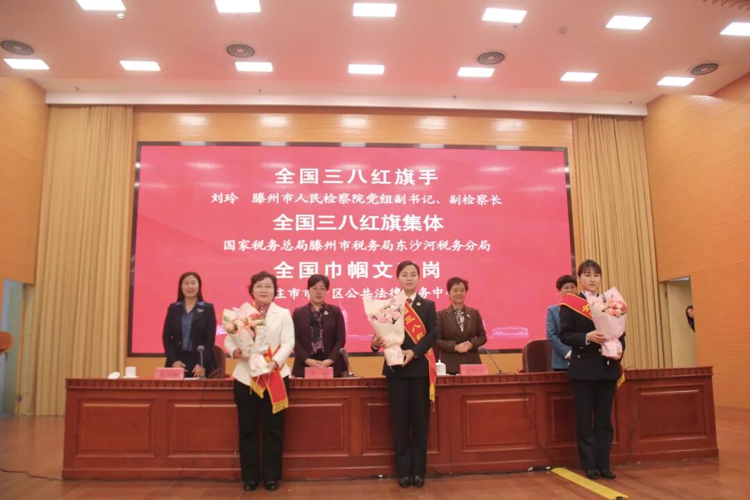 与会领导向获得全国三八红旗手、全国三八红旗集体、全国巾帼文明岗称号个人和集体赠送鲜花,向枣庄市“五好家庭”代表颁发纪念奖杯。